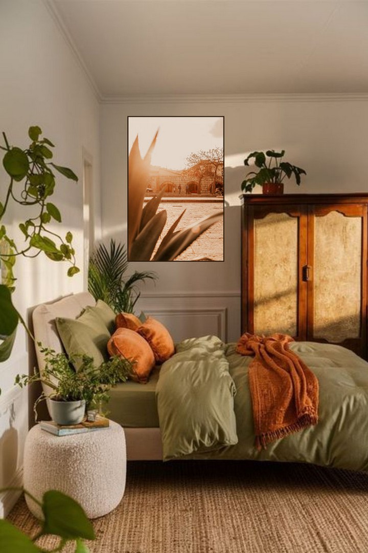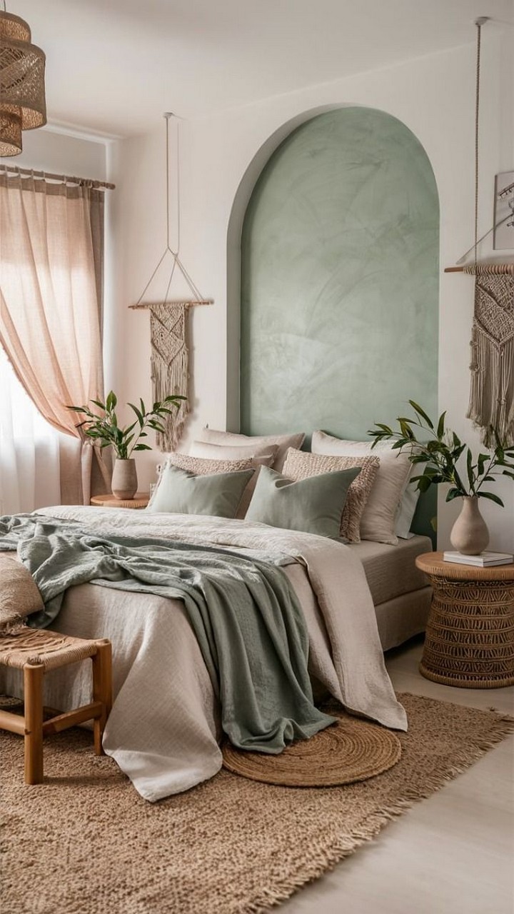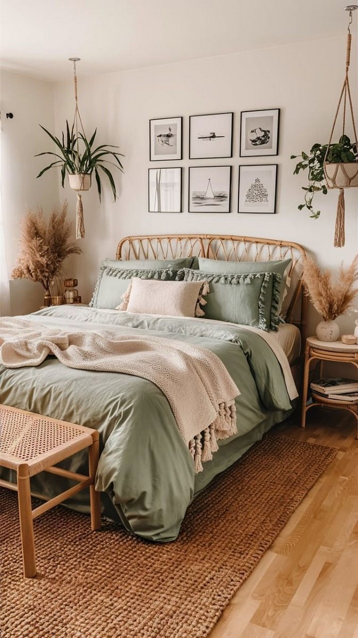 Opt for a velvet or linen tufted headboard in sage green. The soft texture adds sophistication and tactile comfort. It serves as a central visual feature that enhances the room’s cozy boho tone while offering a sense of calm and luxury.