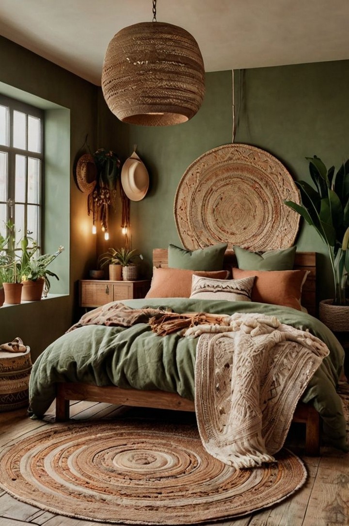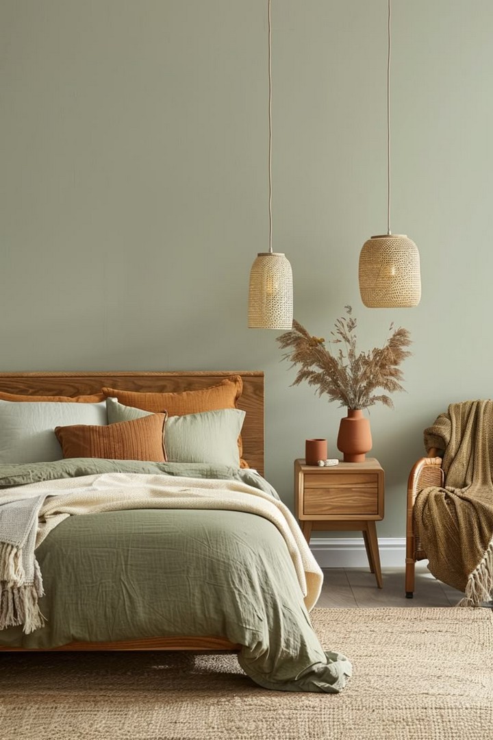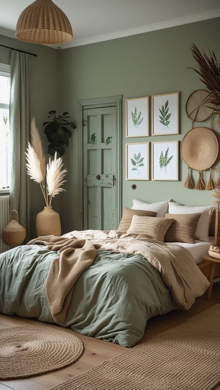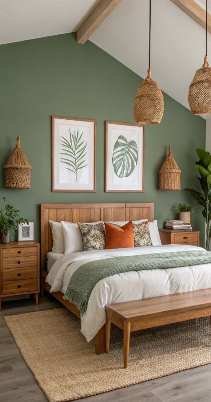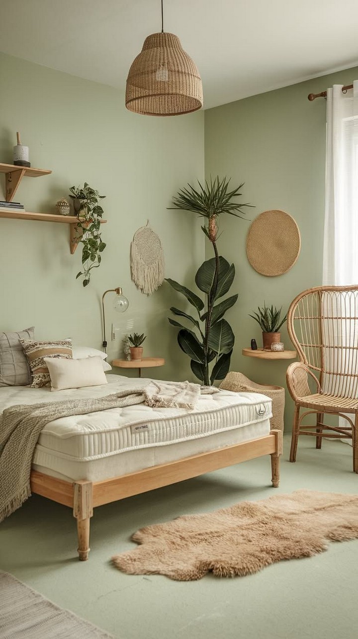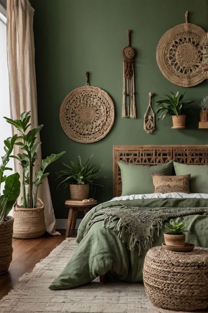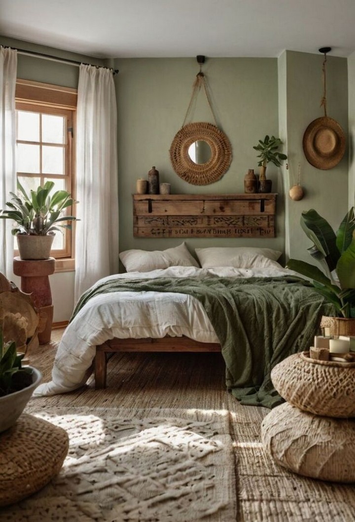 Paint one wall in sage green behind a natural wood bed frame. This striking contrast adds depth and warmth, tying in nature-inspired themes that define boho aesthetics.