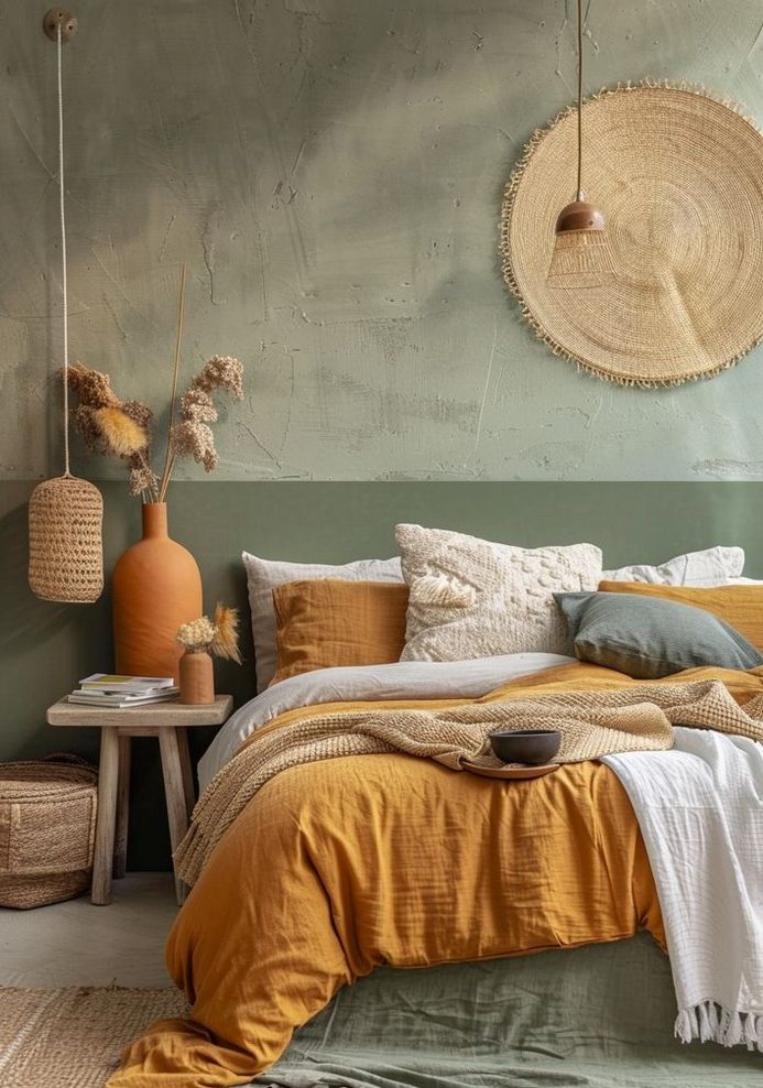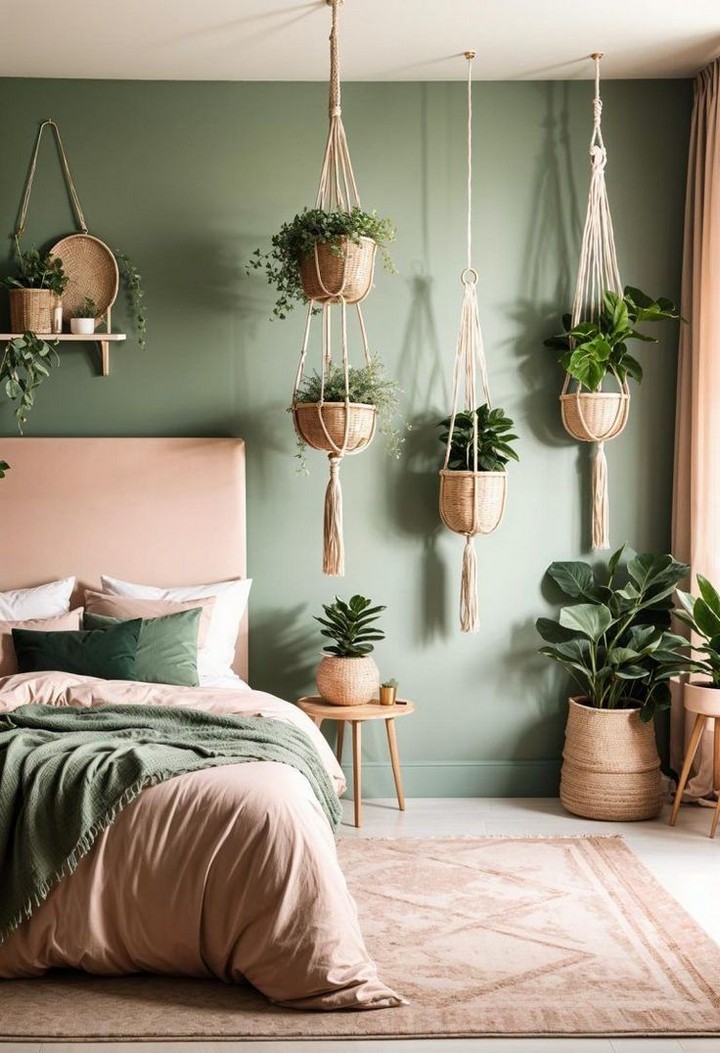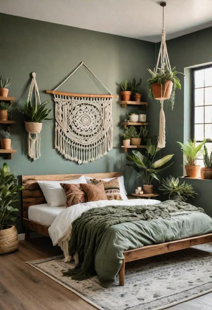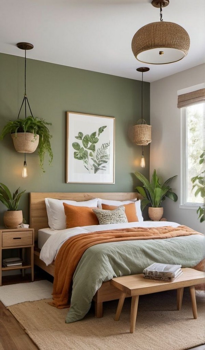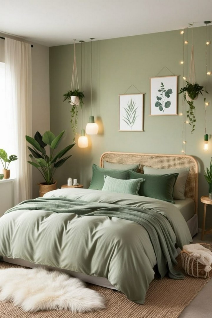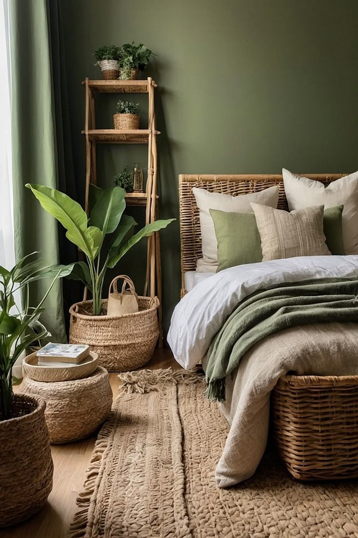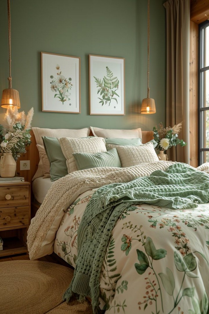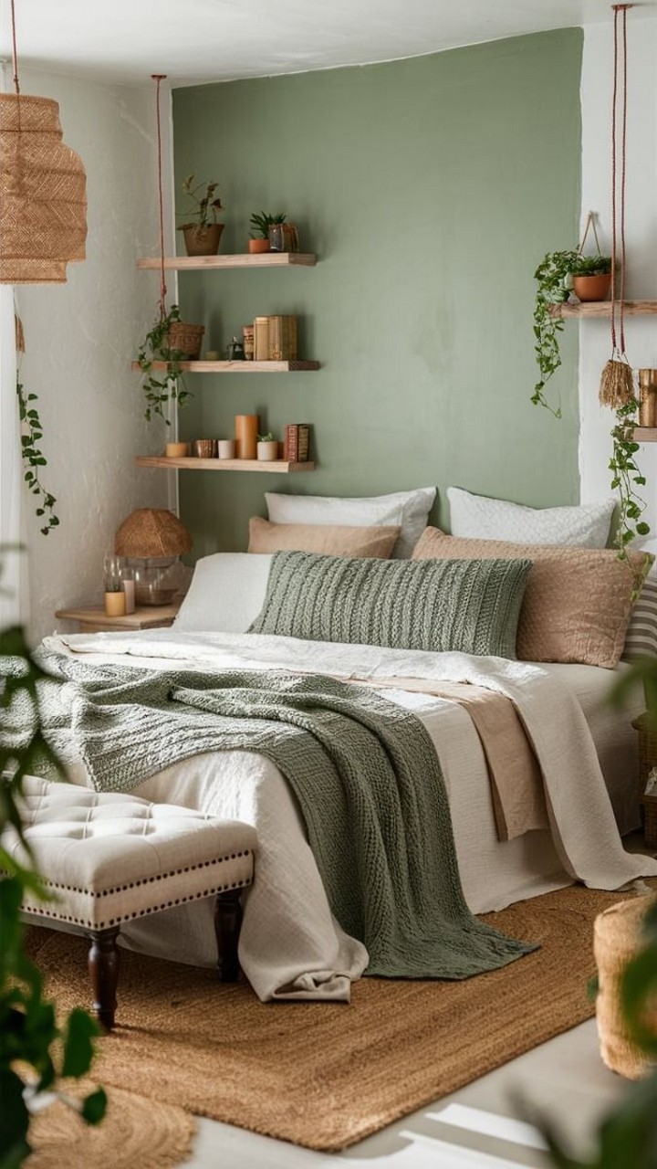 Paint one wall in sage green behind a natural wood bed frame. This striking contrast adds depth and warmth, tying in nature-inspired themes that define boho aesthetics.