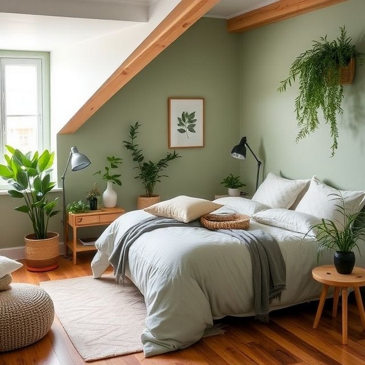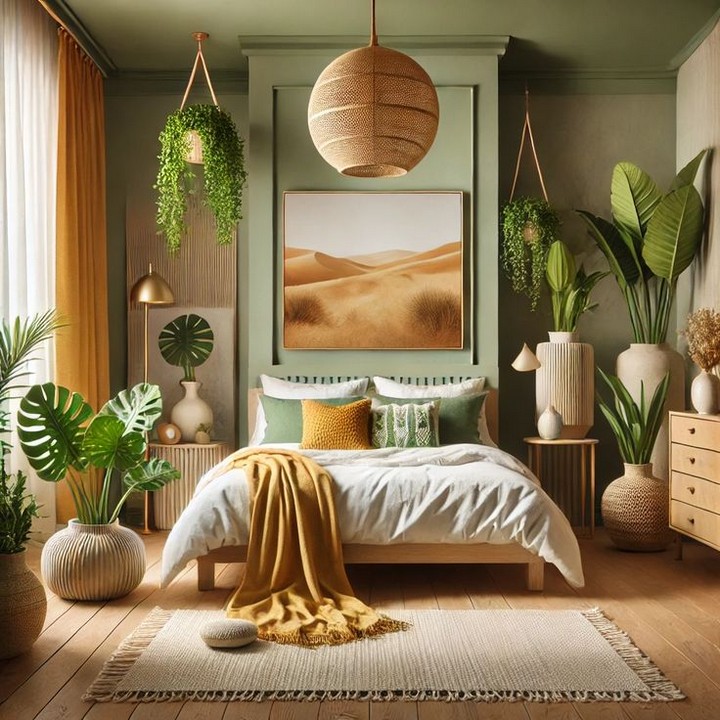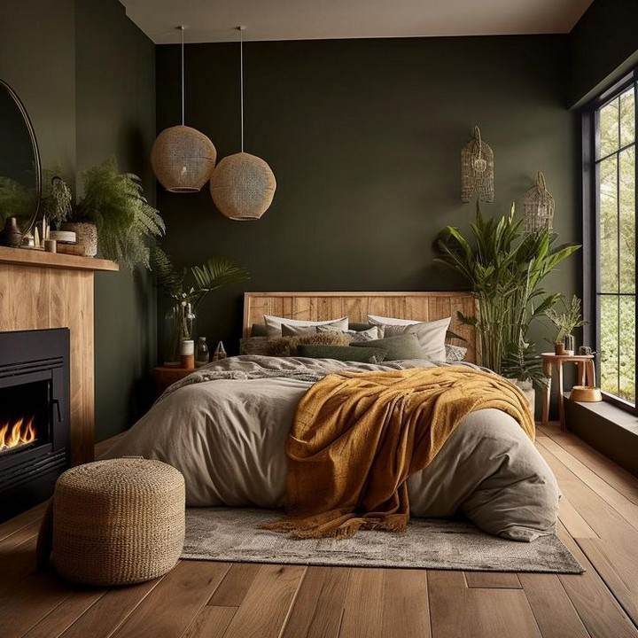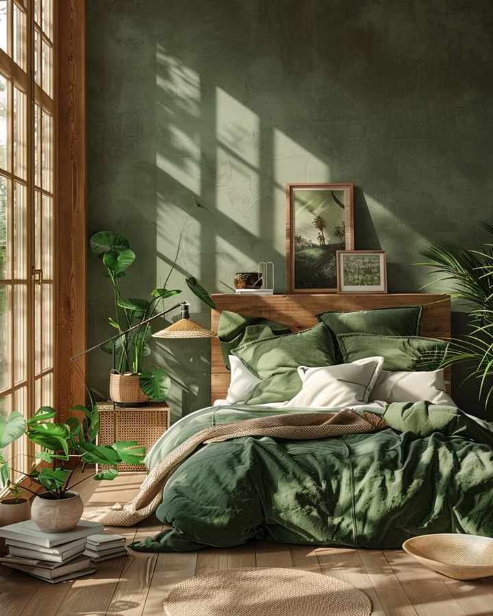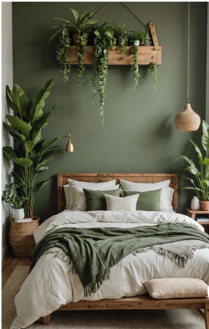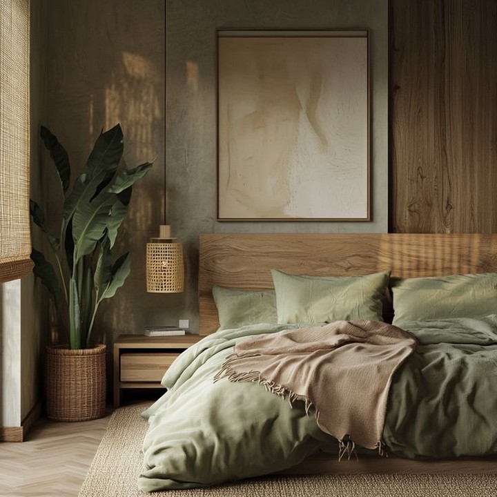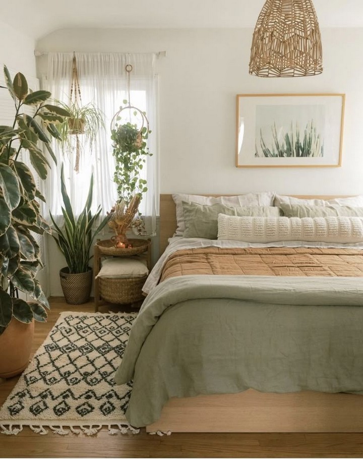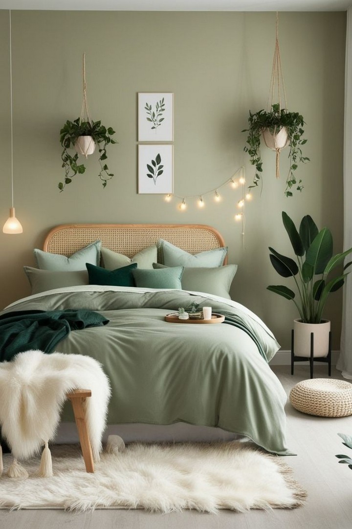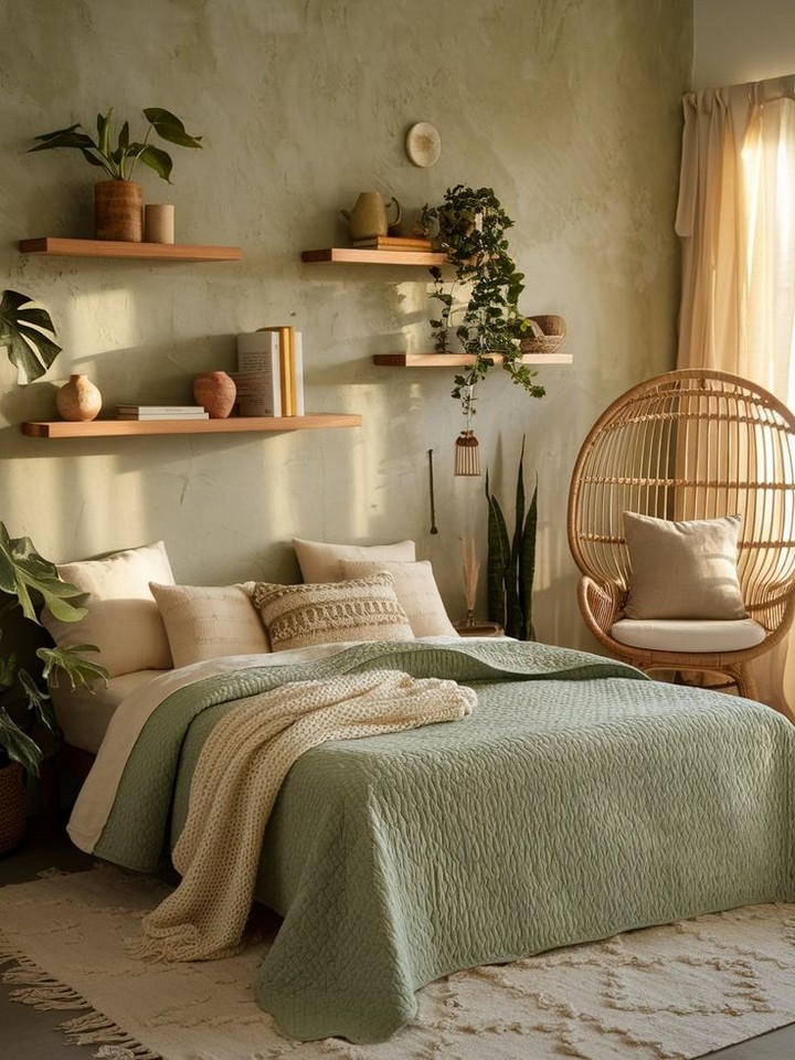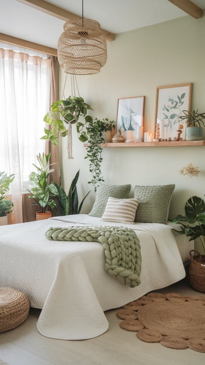 Paint one wall in sage green behind a natural wood bed frame. This striking contrast adds depth and warmth, tying in nature-inspired themes that define boho aesthetics.