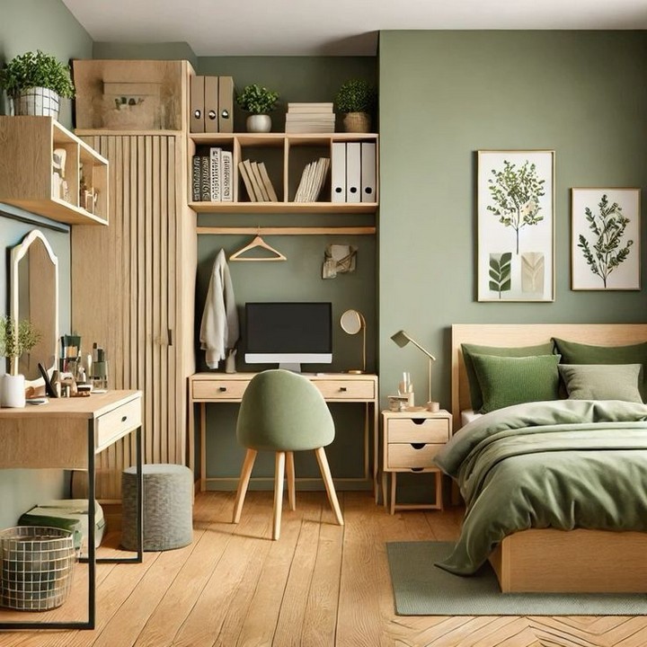 Update your bedroom’s doors or closet panels with a fresh coat of sage green paint. It’s a creative way to weave the color into larger elements without needing new furniture. The transformation feels cohesive, subtle, and visually pleasing.