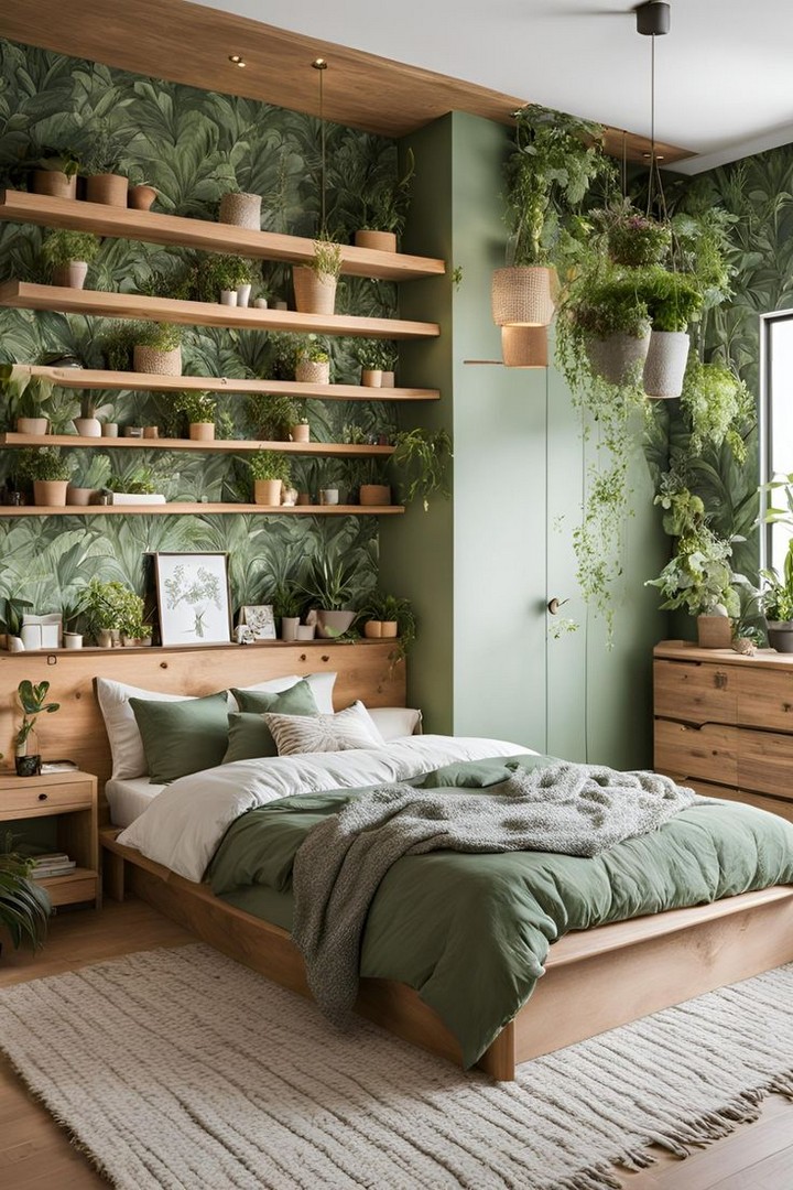 Introduce patterned wallpaper with subtle sage leaves, vines, or floral designs. Use it on a feature wall behind the bed or around a reading nook. It adds charm and visual texture, blending botanical inspiration with a modern bohemian palette.