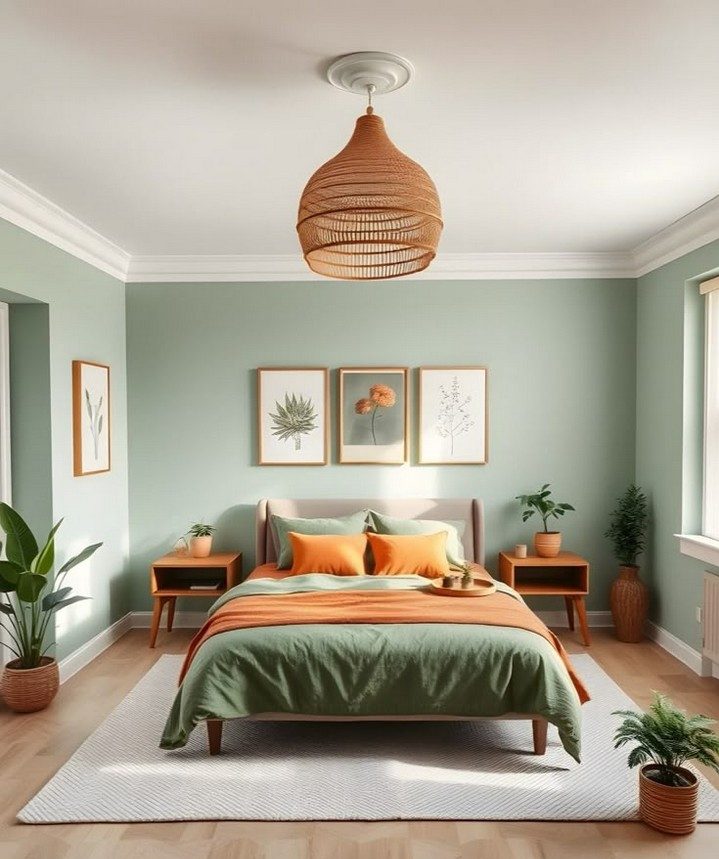 Combine sage green with terracotta through pillows, vases, or art. This earthy combo brings warmth and vibrancy, ideal for boho aesthetics. Terracotta’s bold hue balances sage’s softness, giving the room a grounded yet energetic feel without veering from the organic theme.