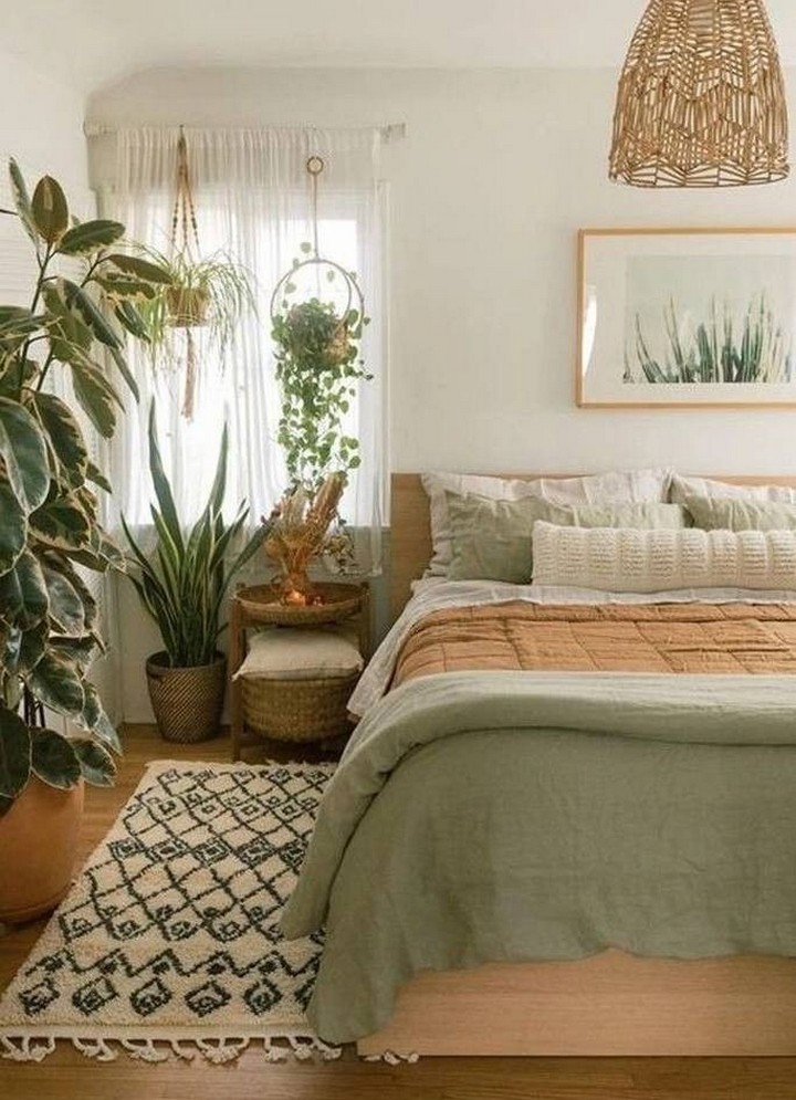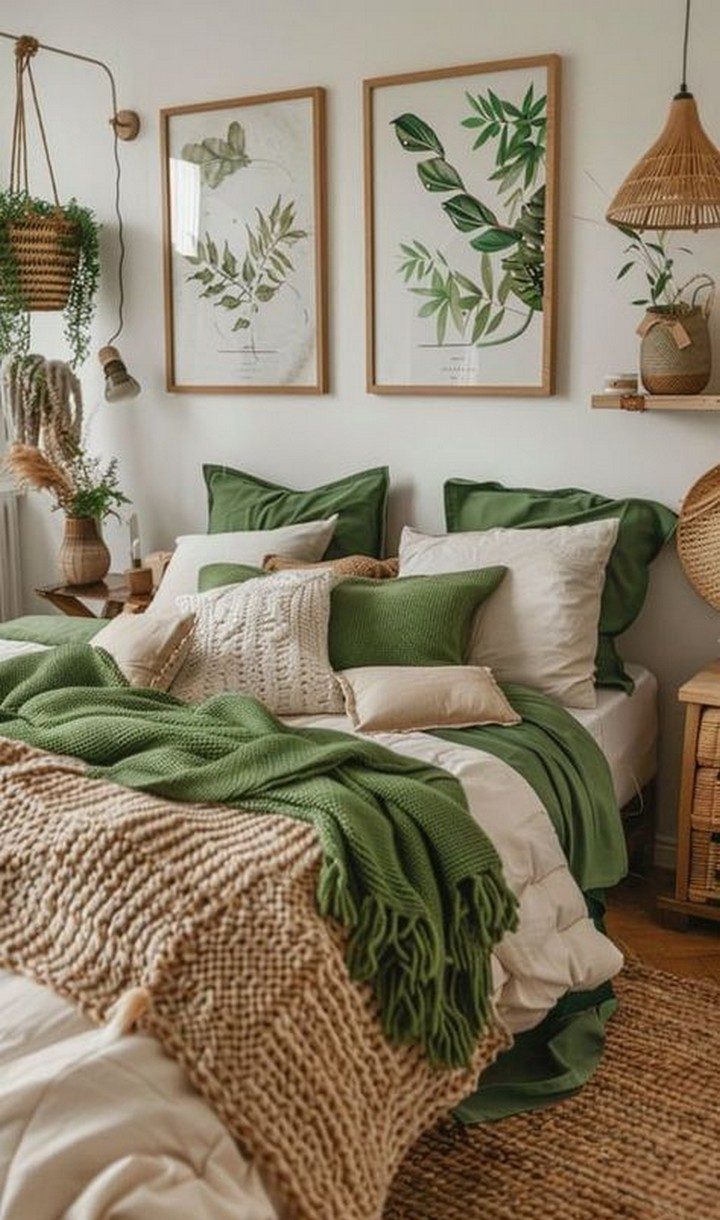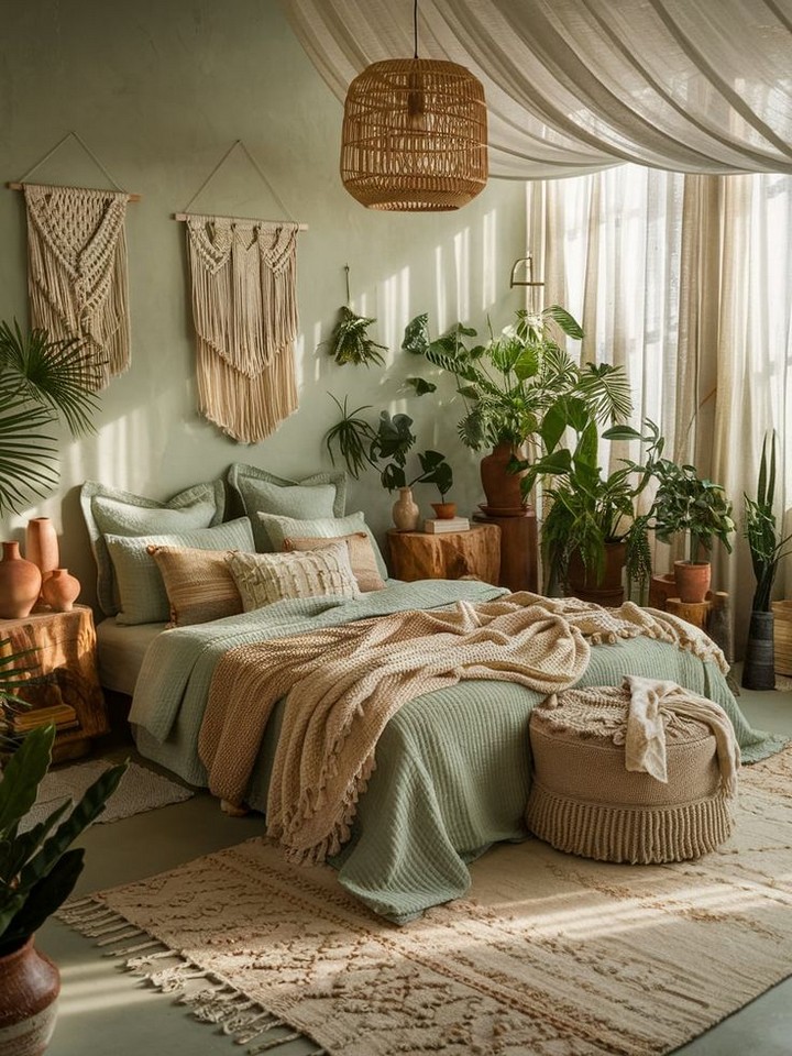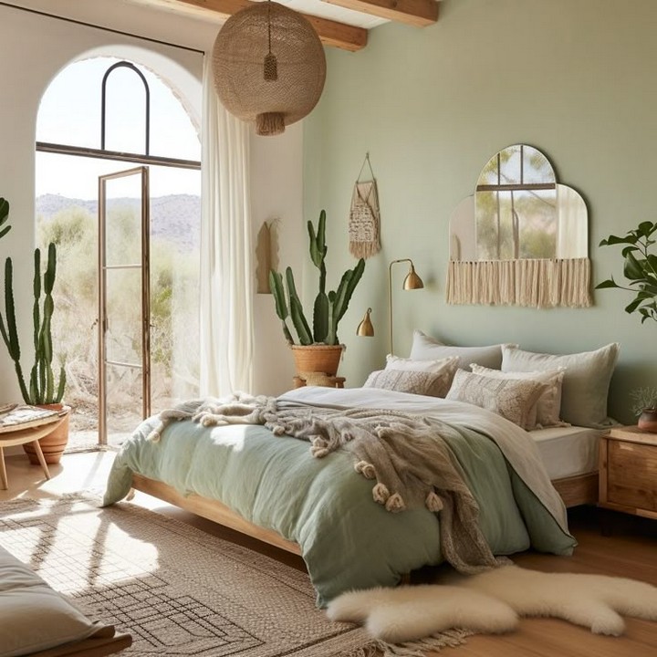 Decorate with a mix of velvet, linen, and cotton pillows in various sage tones. Add beaded or embroidered designs to amplify boho character.