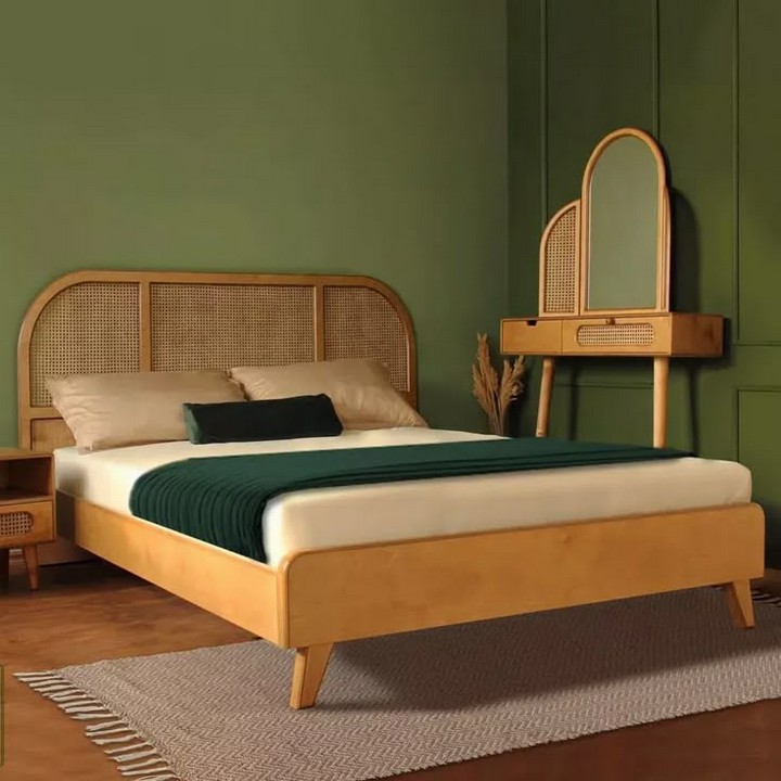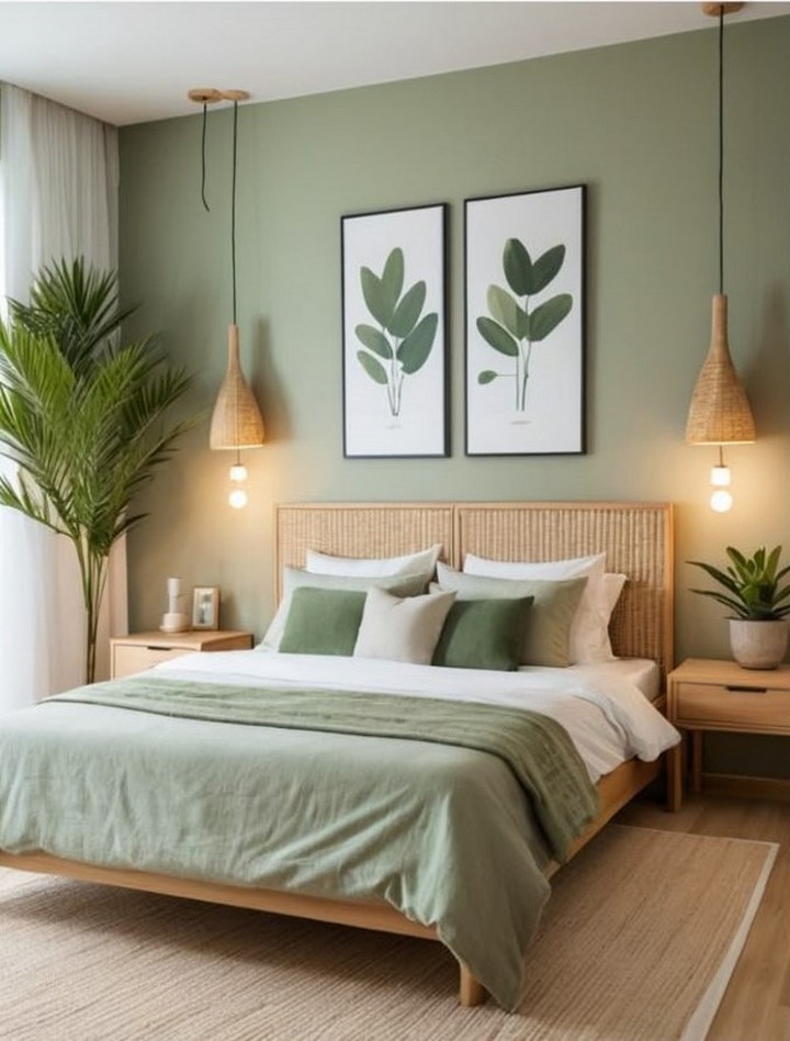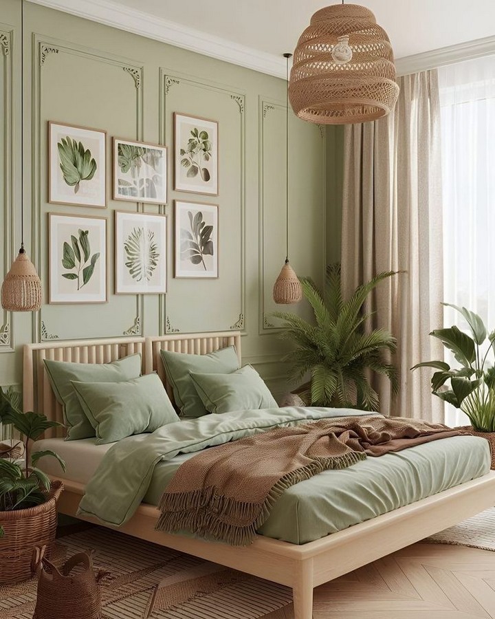 Pair a natural rattan or wicker headboard with sage green pillowcases or wall art. The earthy tone of rattan enhances sage’s calm energy. It’s a great way to bring texture and warmth into a room while preserving a light, breezy atmosphere.