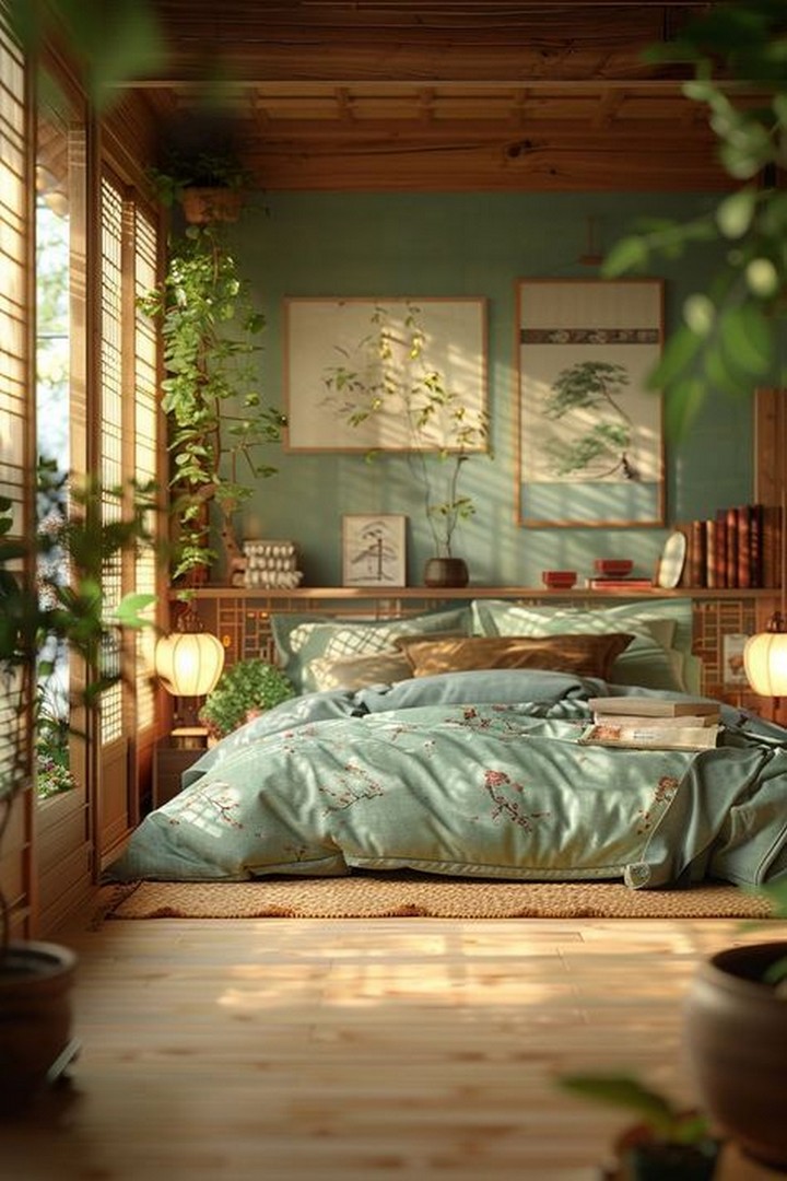 Suspend Moroccan or boho lanterns with sage-tinted glass or painted frames. Their glow enhances cozy evenings and adds an exotic, handmade charm. Hang them beside the bed or over reading nooks to create mood lighting that echoes your design palette.