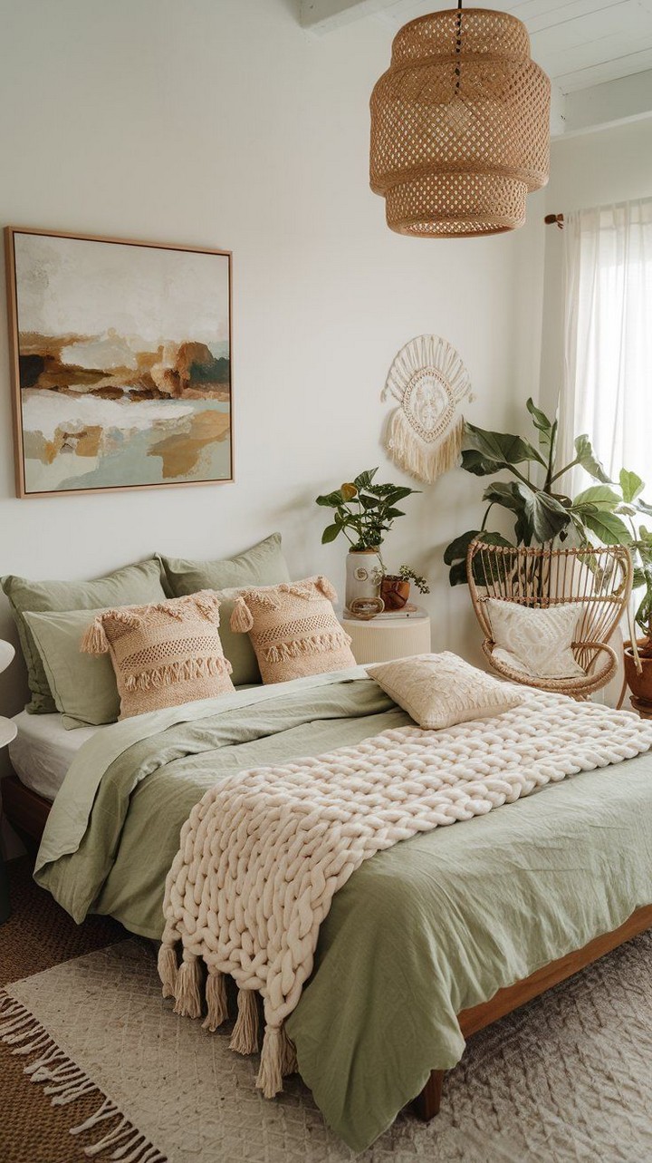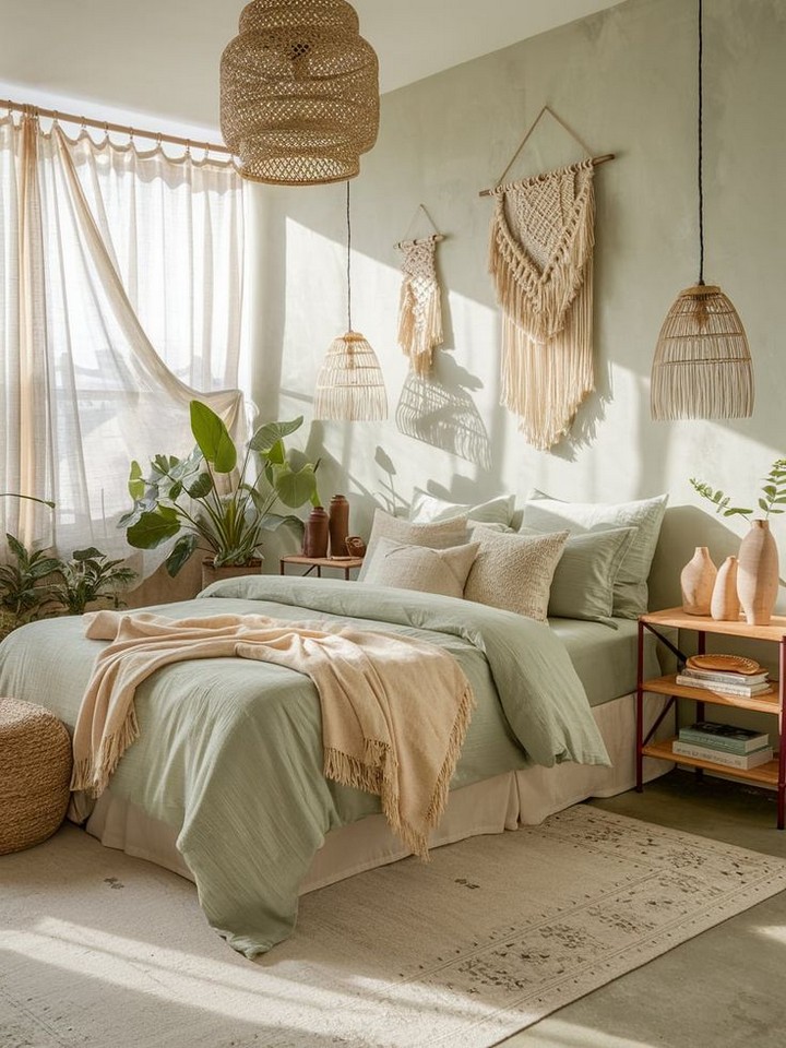 Hang a large tapestry with sage and cream hues above the bed as a statement piece. It sets the tone for a relaxed, artsy atmosphere and adds visual interest. Choose mandala, floral, or abstract designs to align with your boho aesthetic.