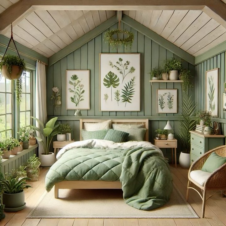 Add dimension and charm with sage green shiplap or paneling. It offers a rustic feel, pairing perfectly with boho elements like layered rugs, hanging plants, and vintage furniture. This backdrop adds both visual interest and soothing color to any bedroom wall.
