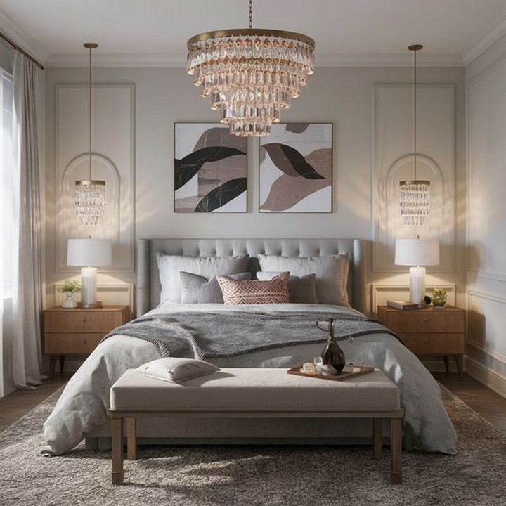 For those who crave luxury, opulence, and sophistication, an inspiration for a luxurious master bedroom can include ornate headboards, plush bedding, and sumptuous textures. Rich, deep colors like emerald green, navy blue, or regal purple can add a regal touch, while metallic accents and crystal chandeliers can bring a sense of glamour to the space. Soft throw blankets, velvet upholstery, and statement furniture pieces can elevate the room, creating a sense of indulgence and elegance.