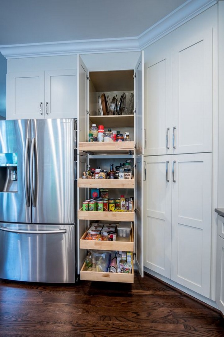 Install a pull-out pantry system with narrow shelves or baskets that can be pulled out to reveal hidden storage. This is a space-saving solution for small kitchens.