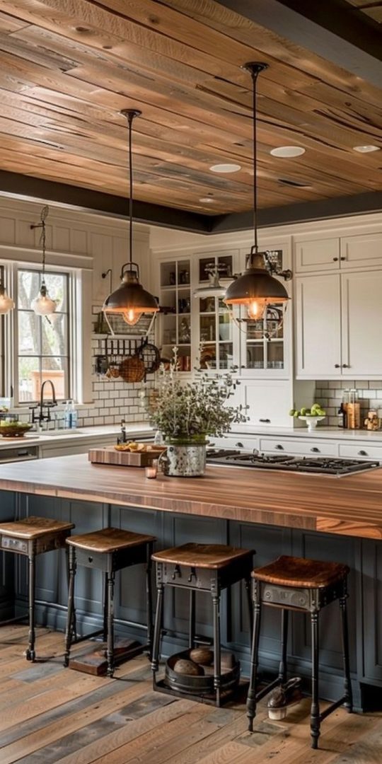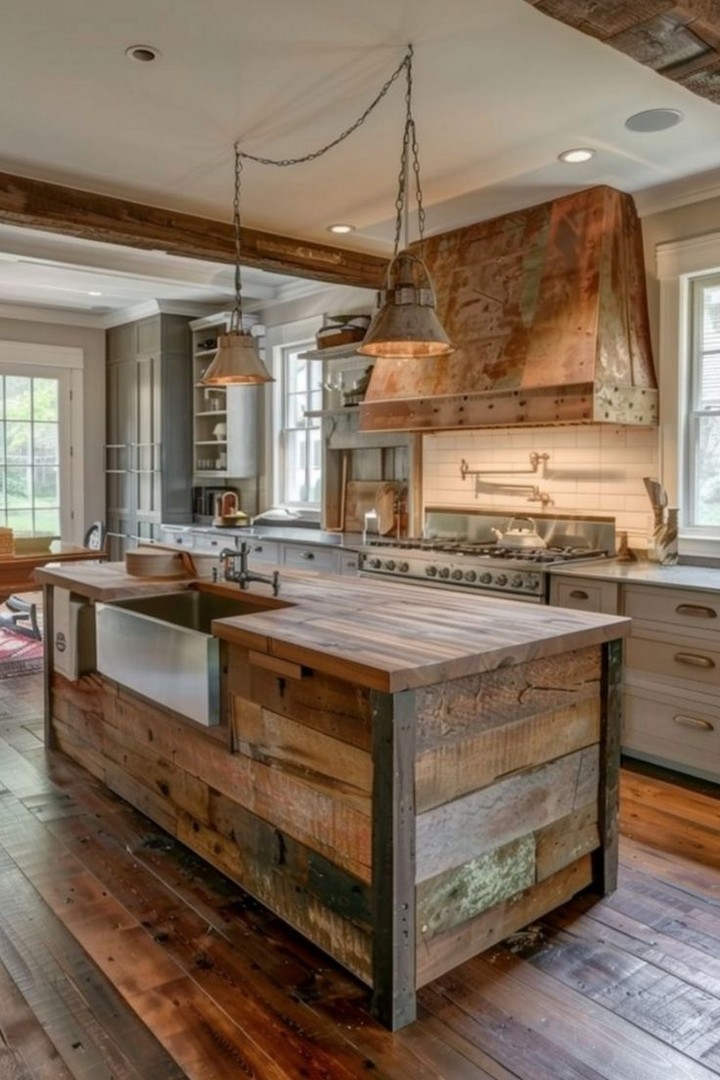 Design a farmhouse-style kitchen with a large farmhouse sink, open shelving, and shaker-style cabinets. Use natural materials like butcher block countertops and incorporate vintage-inspired fixtures for an inviting and nostalgic feel.