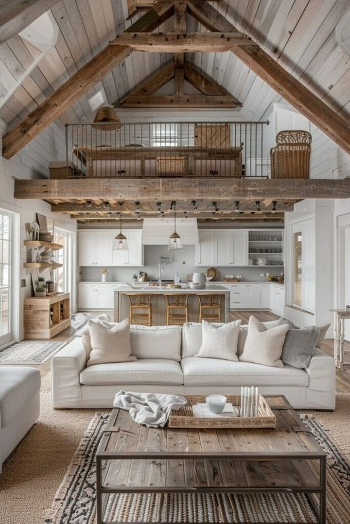 Highlight the barn-like structure of your barndominium by leaving the ceiling beams exposed. The natural wood adds texture and character to the space while lending a touch of rustic charm.