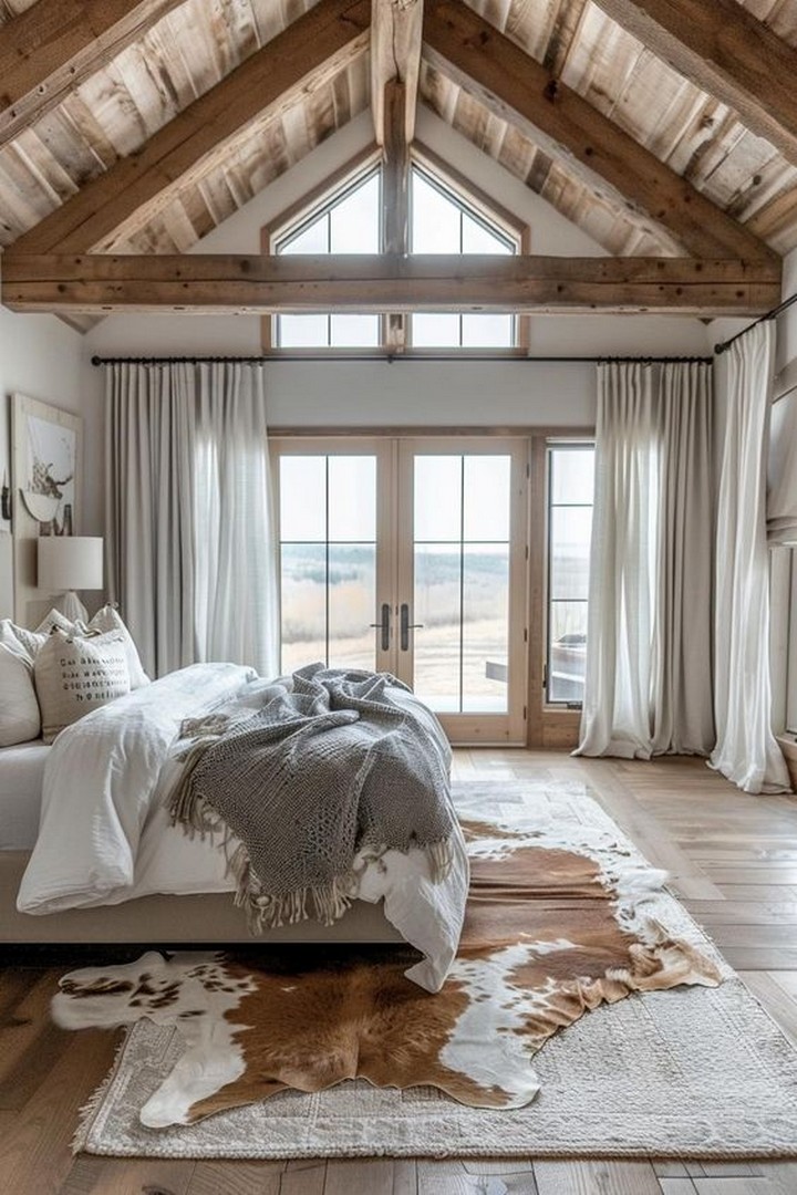 Design a farmhouse-inspired bedroom by incorporating a wrought-iron bed frame, vintage bedside tables, and rustic lighting fixtures. Soft, natural linen bedding and floral or plaid accents will further enhance the cozy farmhouse feel.