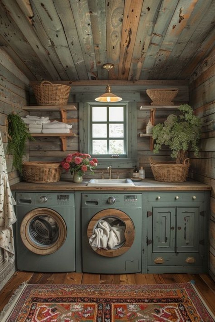 Design a farmhouse-style laundry room with open shelves, a farmhouse sink, and subway tile backsplash. Incorporate vintage-inspired storage solutions such as wire baskets or glass jars for a charming and organized space.