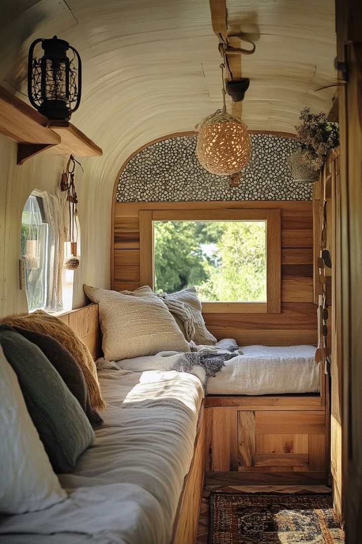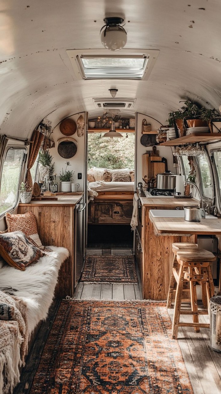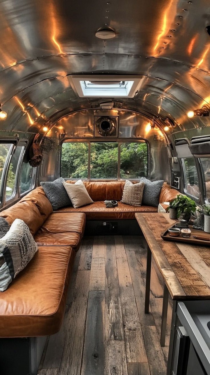 Transform your Airstream’s bathroom with antique brass fixtures, a stone vessel sink, and Tuscan-style tiles. Add vintage mirrors and candle sconces for a luxurious feel.