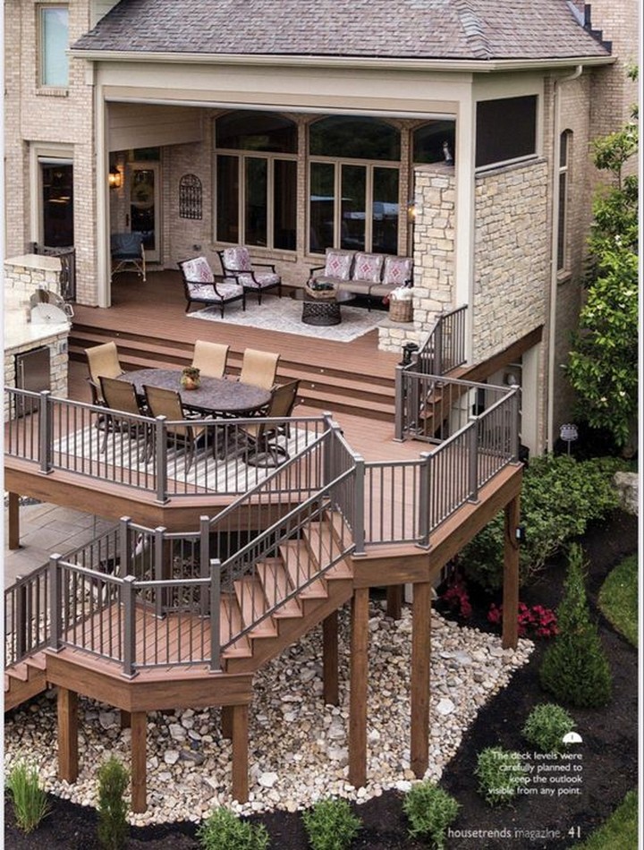 Design a multi-level deck with different sections for various activities like cooking, dining, and relaxation. Incorporate stairs or ramps to connect the levels seamlessly.