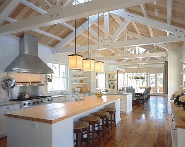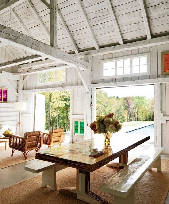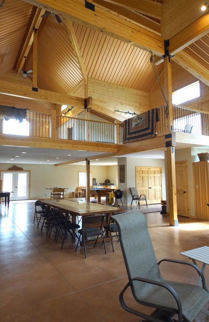 Highlight the architectural features of the barn, such as the exposed wooden beams and trusses. These elements add rustic character and can be left in their natural state or stained to match your interior.