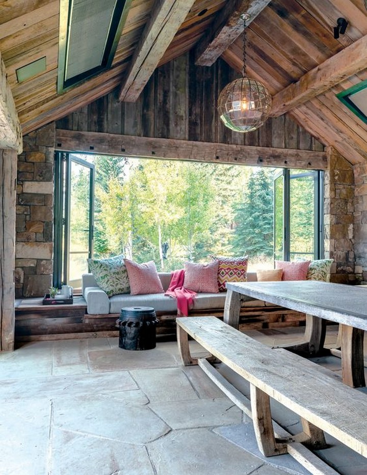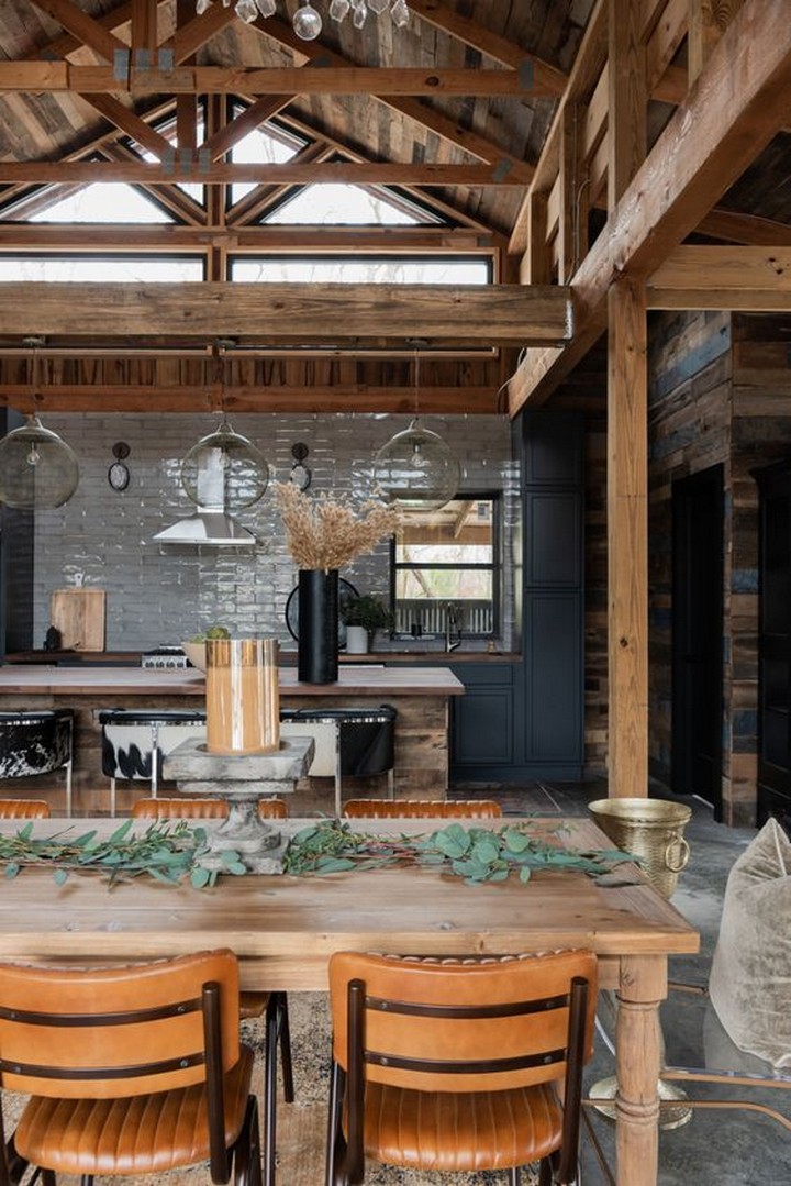 Incorporate industrial-style elements like metal light fixtures, exposed ductwork, and steel railings to contrast with the rustic aspects of the space.