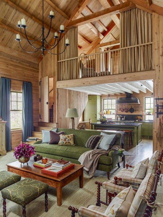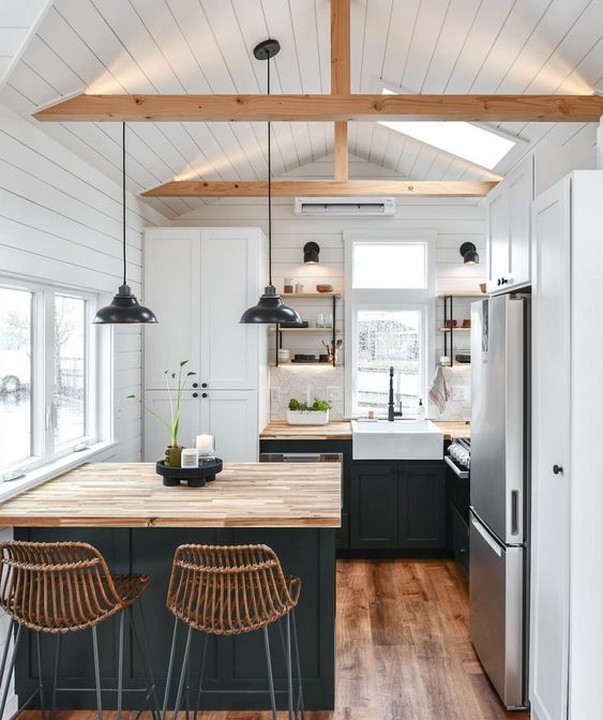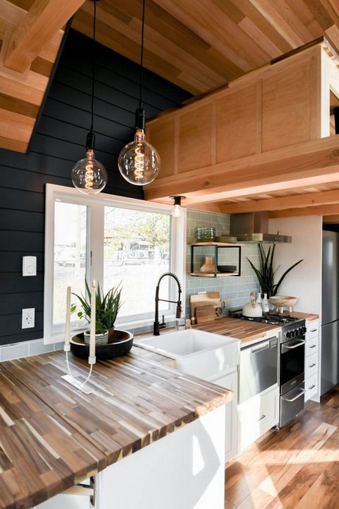 Use industrial-style light fixtures to add a touch of modernity to the rustic interior. Pendant lights with exposed bulbs or vintage fixtures work well.