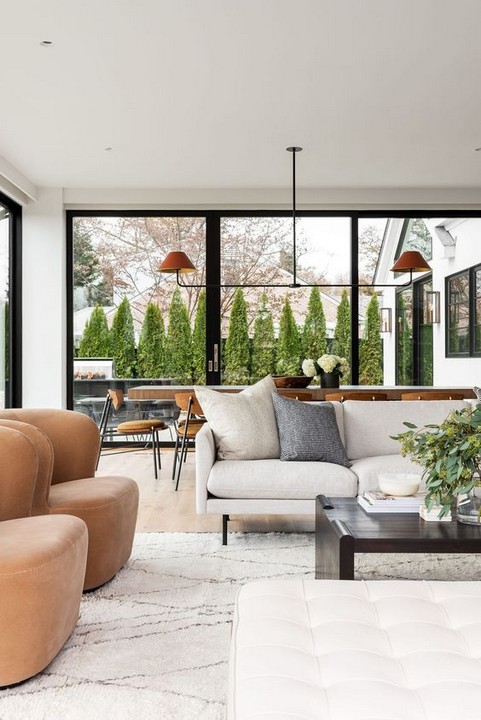 If your living room is adjacent to other rooms, consider sliding or pocket doors to save floor space that would be otherwise required for swinging doors.