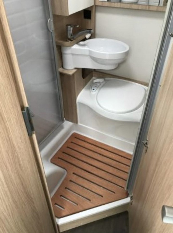 The Hymer Aktiv demonstrates how wet bath concepts can be elevated through thoughtful design. This space-efficient approach integrates shower, toilet, and sink functions in a single waterproof environment. High-end materials like marine-grade teak and premium fixtures transform the utilitarian concept into a luxury experience.