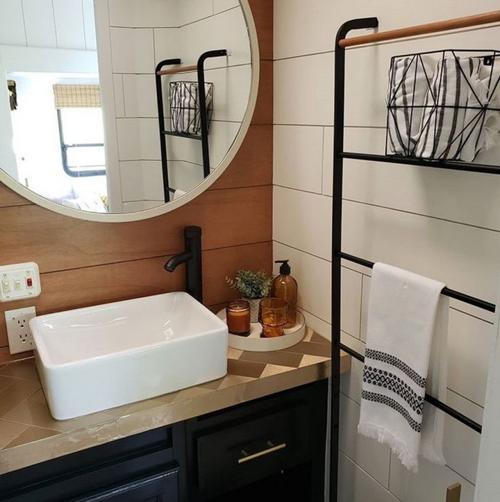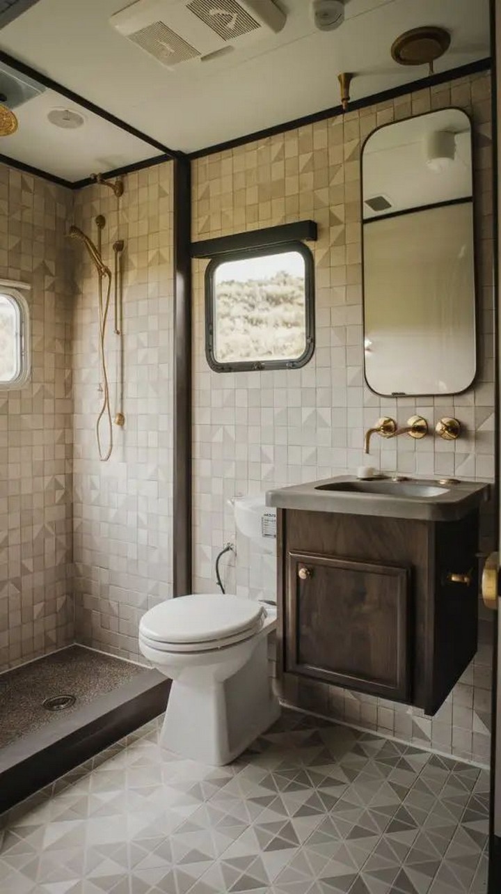 The Airstream Classic’s bathroom renovation demonstrates the transformative power of natural stone. Using lightweight stone veneers or composite alternatives, this design incorporates marble-look countertops and travertine-inspired shower walls. These materials add tactile luxury while maintaining the weight considerations essential for RVs.