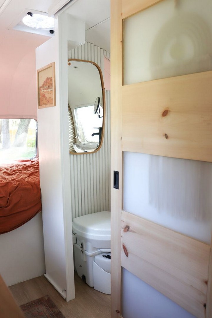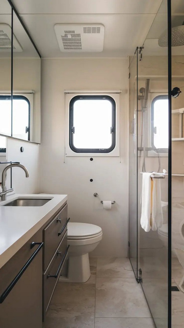 The Airstream International incorporates expanded skylights and frosted privacy windows that flood the bathroom with natural light. This approach creates a connection with the outdoors while maintaining privacy.