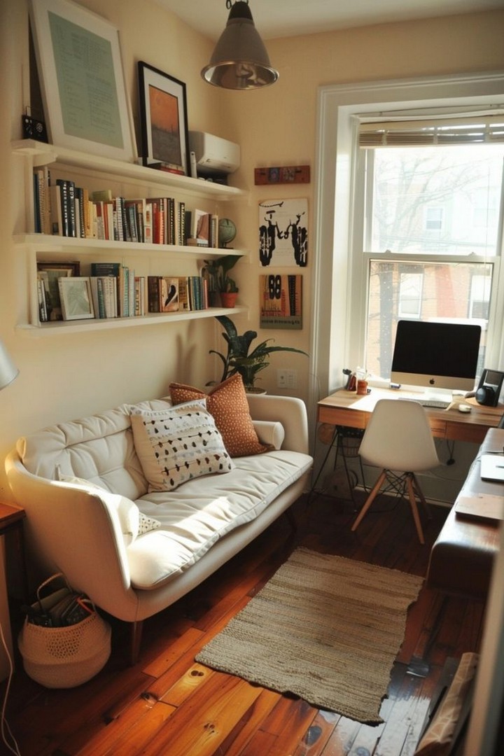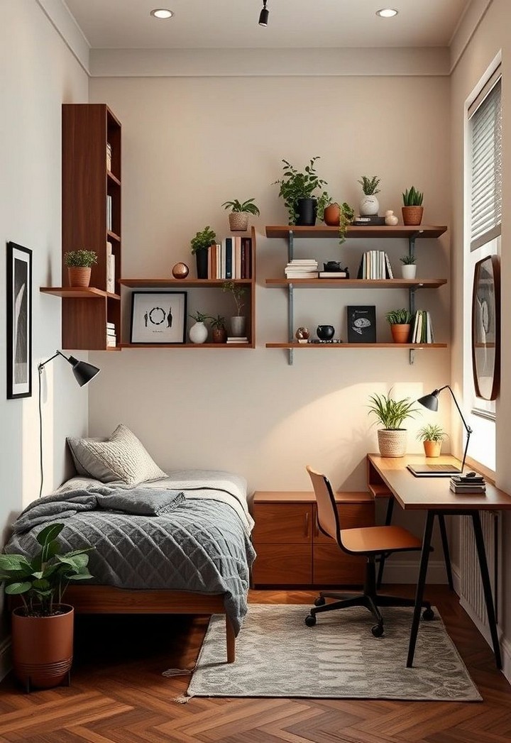 Wall-mounted shelves are ideal for displaying books, plants, or decorative items without taking up valuable floor space. Installing shelves above eye level can help create storage without cluttering up the space you walk through.