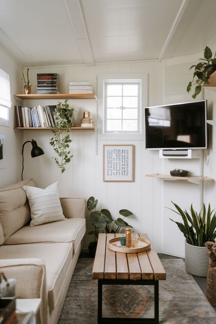 Ladder shelves are not only visually striking but also provide functional storage. These can hold books, plants, or other decorative items, and the open design allows them to fit seamlessly into small spaces.