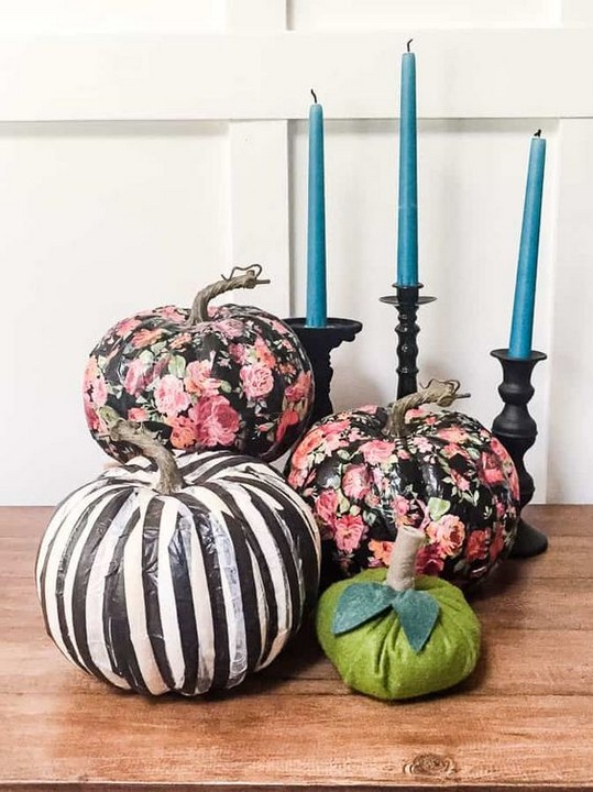 Apply small pieces of patterned tissue paper to your pumpkin with Mod Podge for a whimsical look.