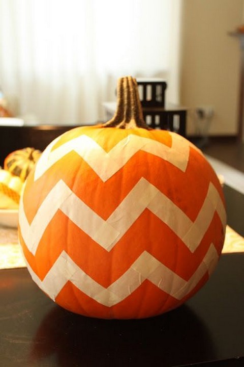 Use masking tape to create geometric designs on your pumpkin, then paint over it and remove the tape for sharp, clean lines.