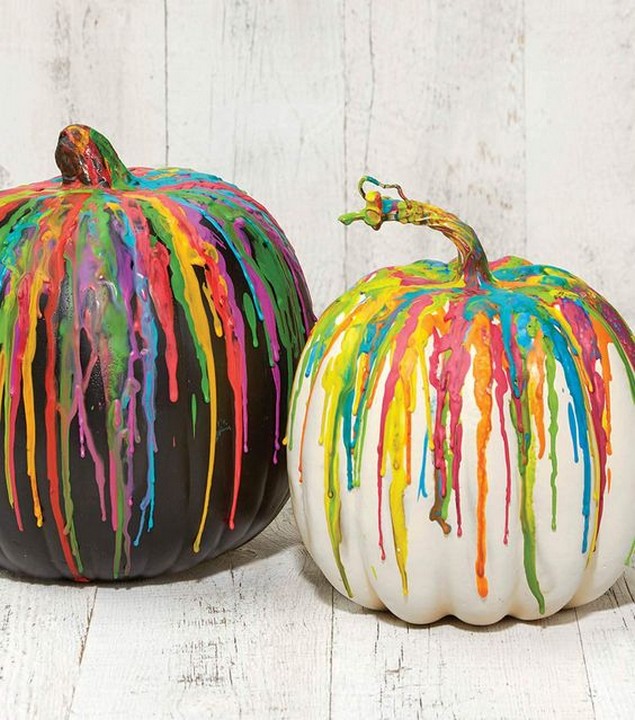 Glue crayons to the top of your pumpkin, then use a hairdryer to melt the crayons, creating colorful drips down the sides.
