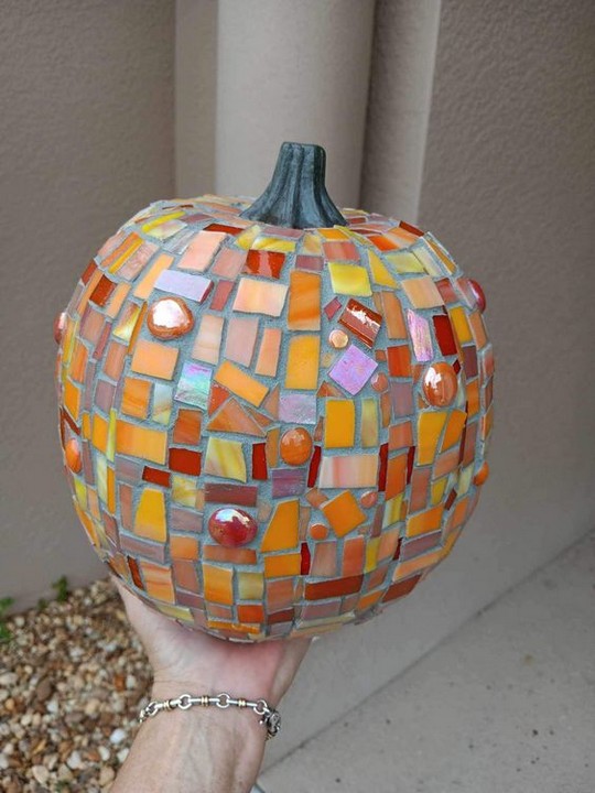 Create a mosaic design by adhering small, colorful glass or ceramic tiles to your pumpkin’s surface.