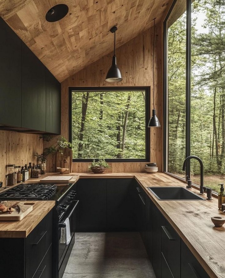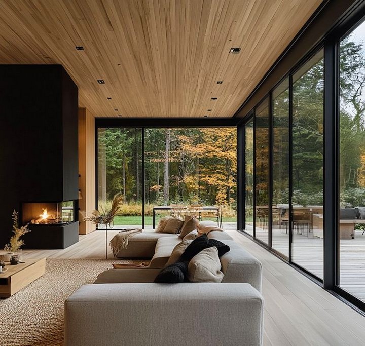 Set among towering pines, this single-story structure features a low-pitched roof and extended eaves that echo traditional Nordic forest dwellings. Exterior walls combine vertical charred timber cladding with large windows that reflect the surrounding trees. Inside, unfinished pine paneling contrasts with polished concrete floors and minimalist white kitchen cabinetry. A central fireplace constructed from local fieldstone serves as both a visual anchor and practical heat source.
