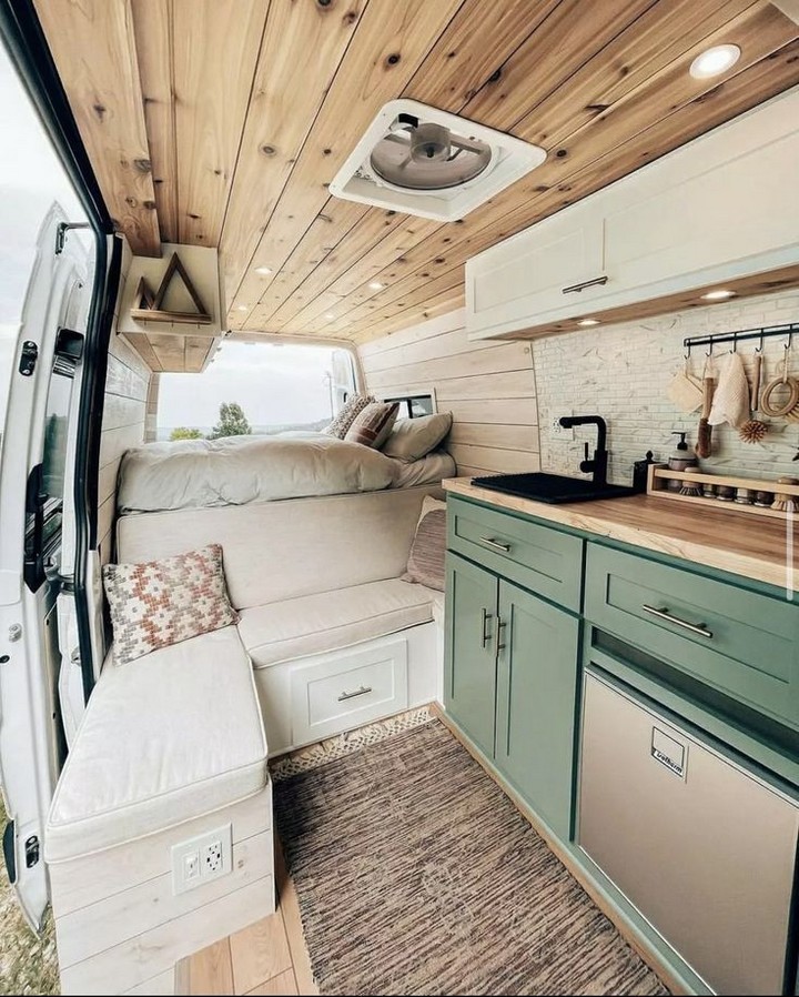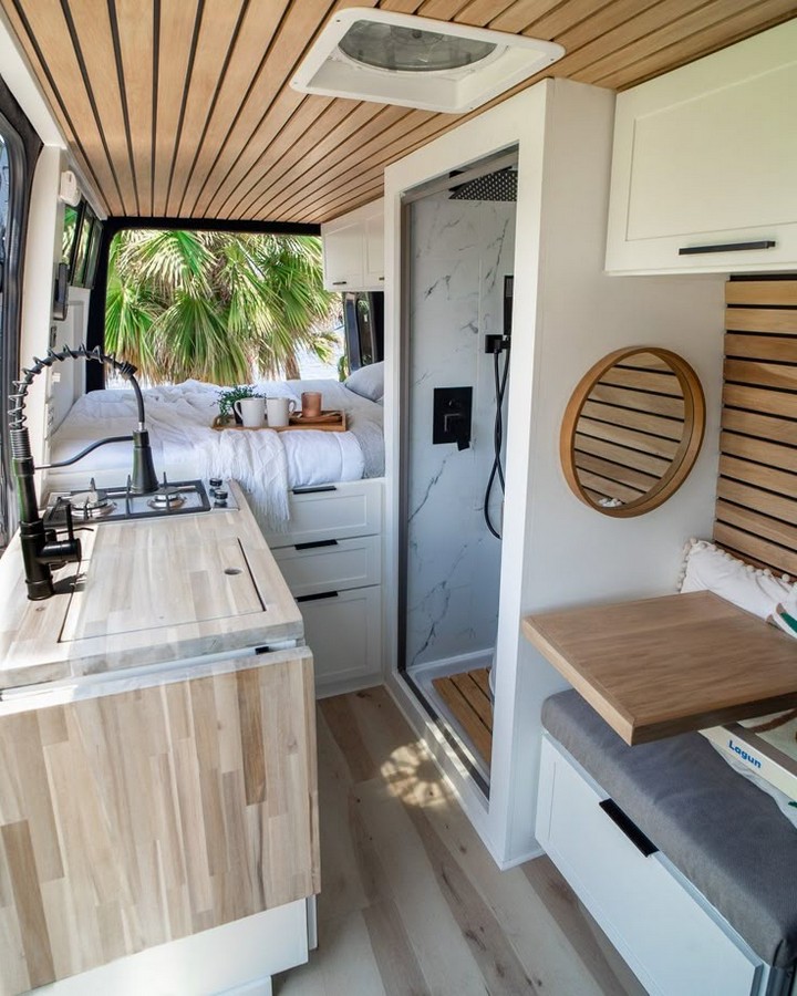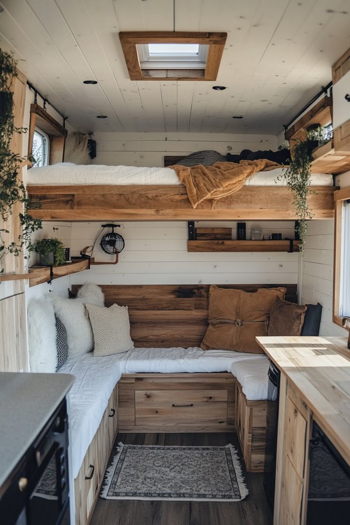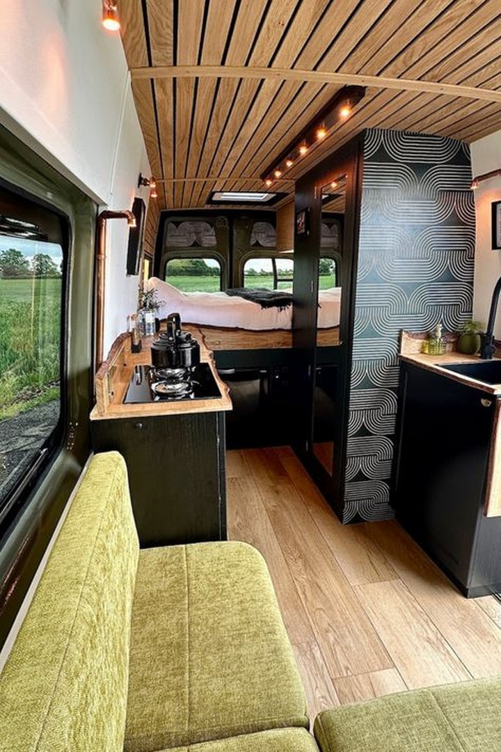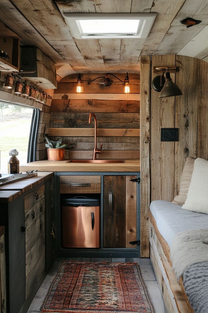 - Reclaimed Wood: Use reclaimed wood for furniture, shelving, and paneling to add rustic charm and sustainability to your van.