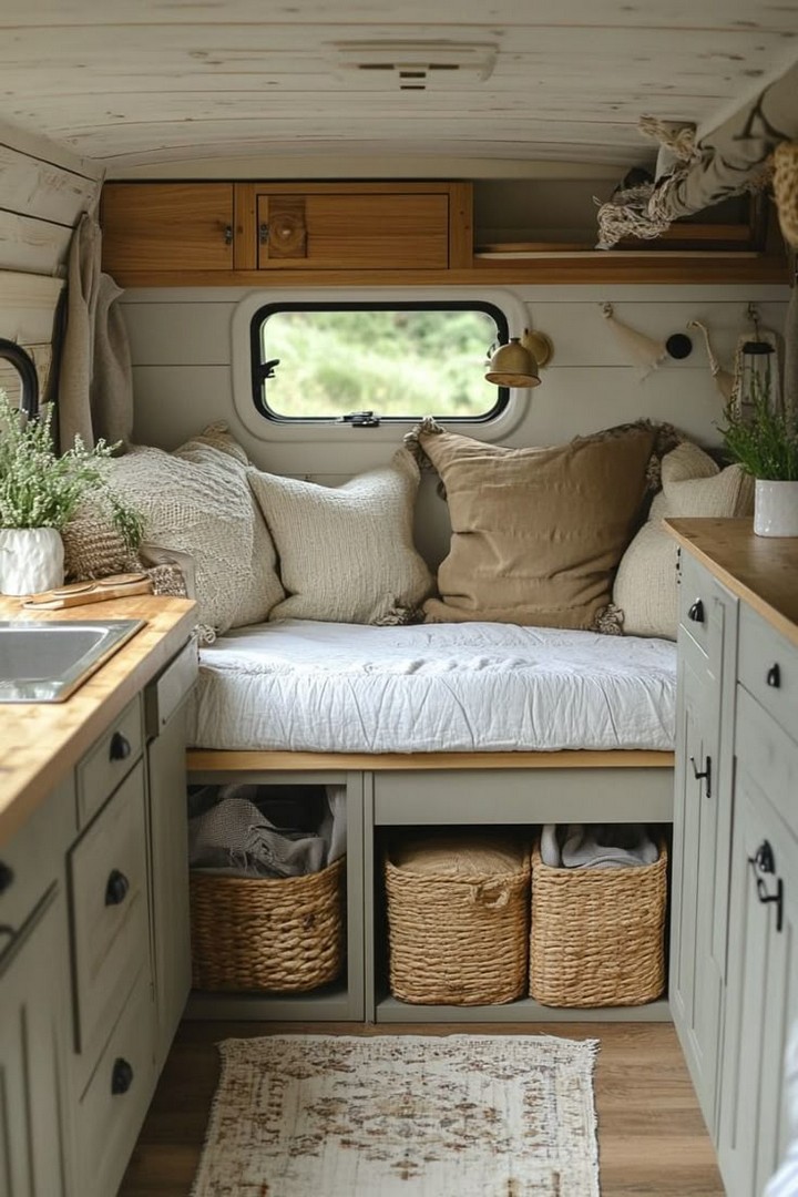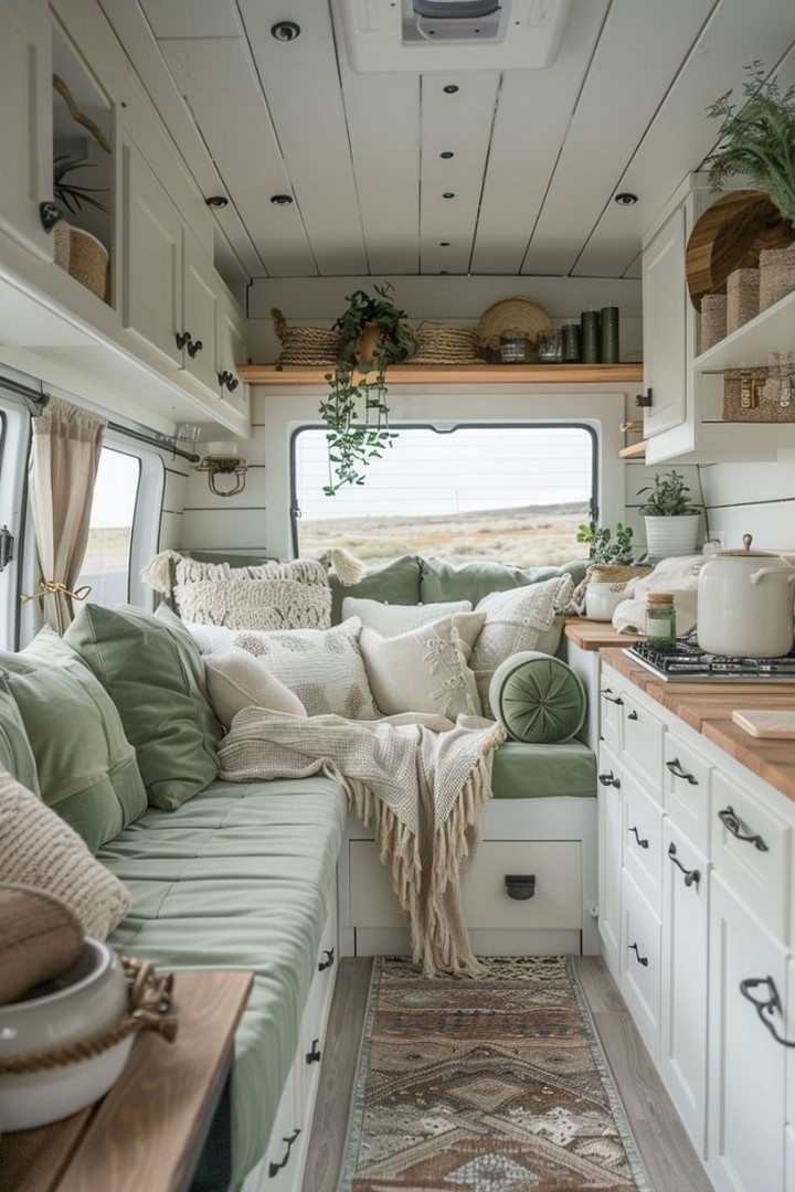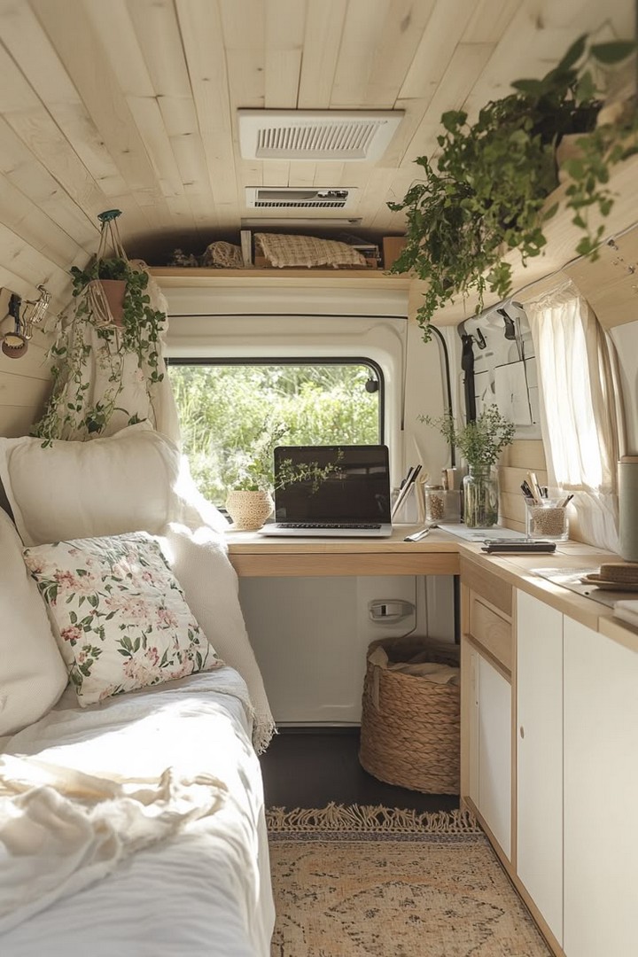 - Neutral Color Palette: White, light gray, and beige tones dominate the space, allowing the natural light to bounce off the walls and make the van feel larger.