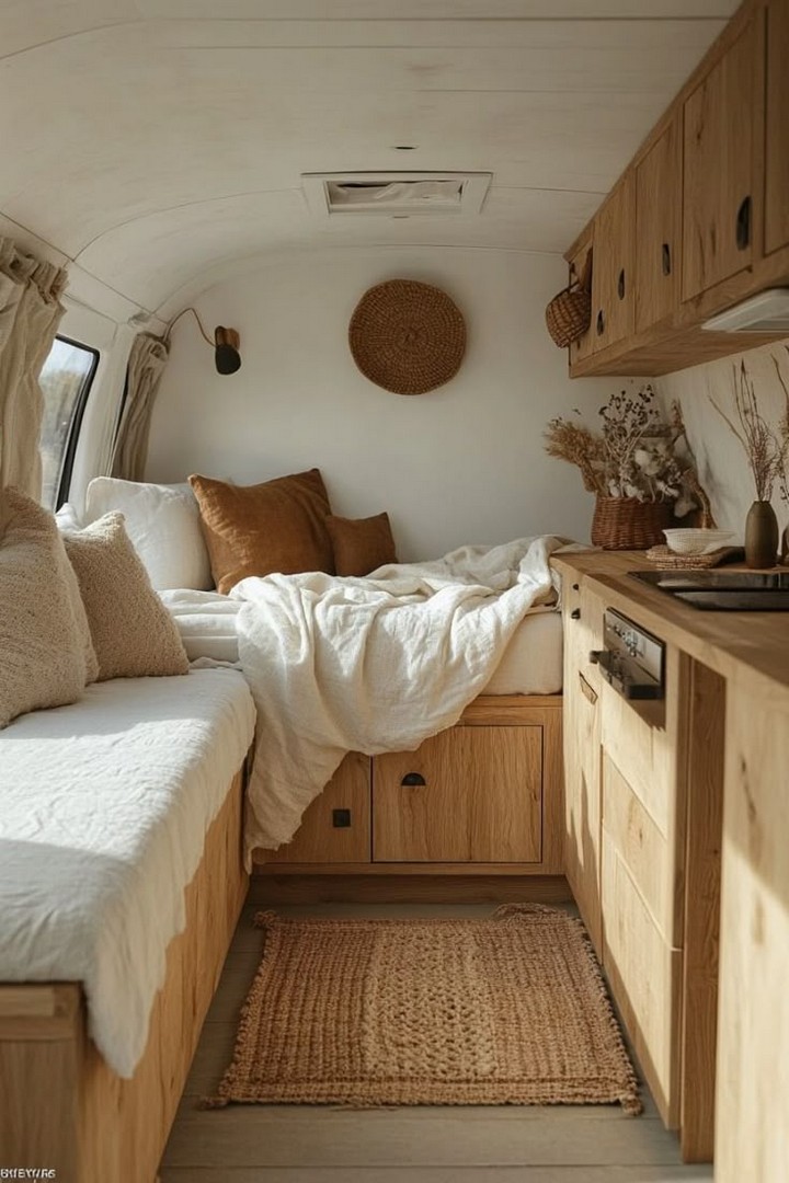 This design is perfect for those who want a calm, Scandinavian-inspired interior that feels open and spacious. The light wood tones combined with minimal decor create a peaceful environment, perfect for relaxing after a long day of driving or exploring.